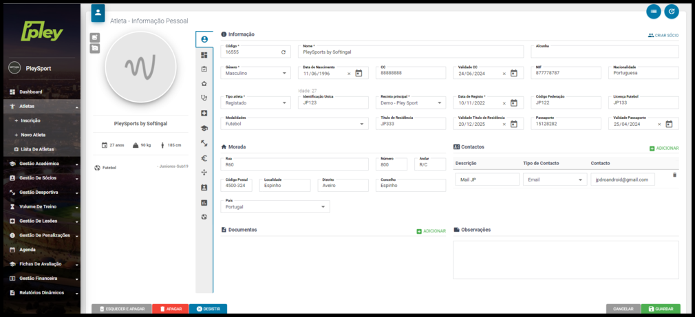 Softingal’s PleySports is a complete and flexible sports management solution designed to help sports clubs of various types manage their activities more efficiently. With an intuitive platform and advanced features, PleySports allows you to manage registrations, organize games and trainings, monitor the performance of athletes, manage finances and much more. Software Sports Management Softingal’s PleySports is a complete and flexible sports management solution designed to help sports clubs of various types manage their activities more efficiently. With an intuitive platform and advanced features, PleySports allows you to manage registrations, organize games and trainings, monitor the performance of athletes, manage finances and much more. Software Sports Management